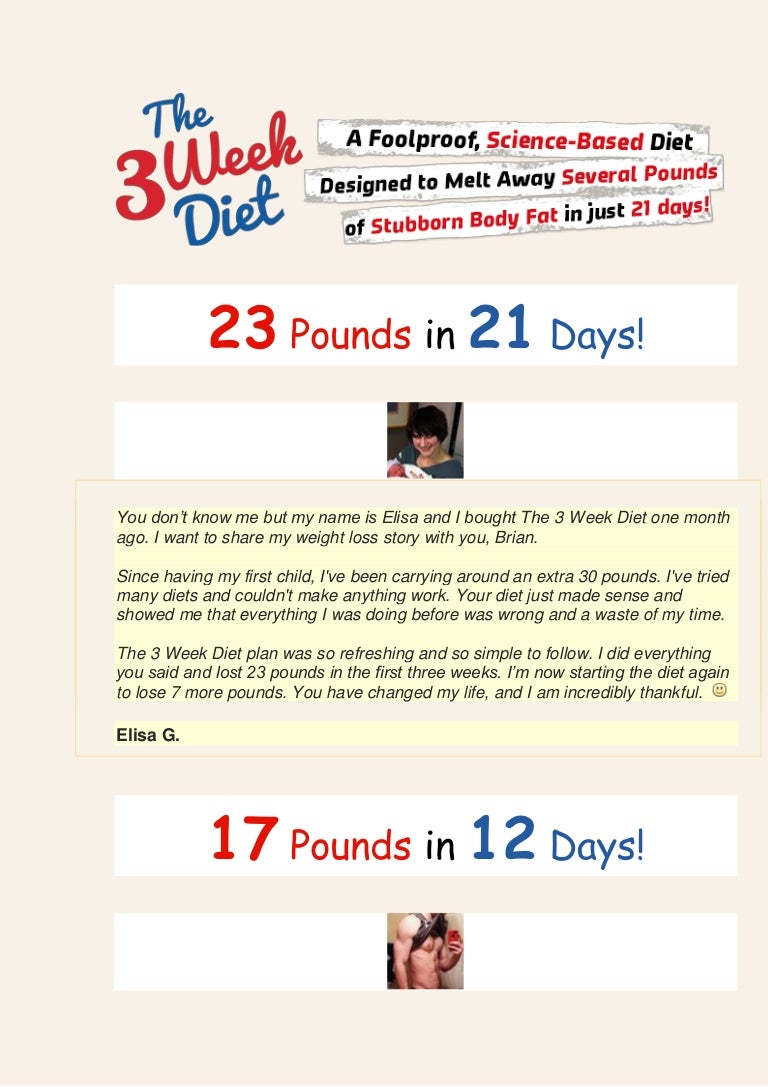 3 Week Diet Reviews How It Works 3 Week Diet System Meal Plan - Flatt says that people who undertake this diet lose an average of 12 to according to the 3 week diet, your results will depend on your dedication and the amount of effort each method alone can have a significant effect so you do not have to incorporate all of them.