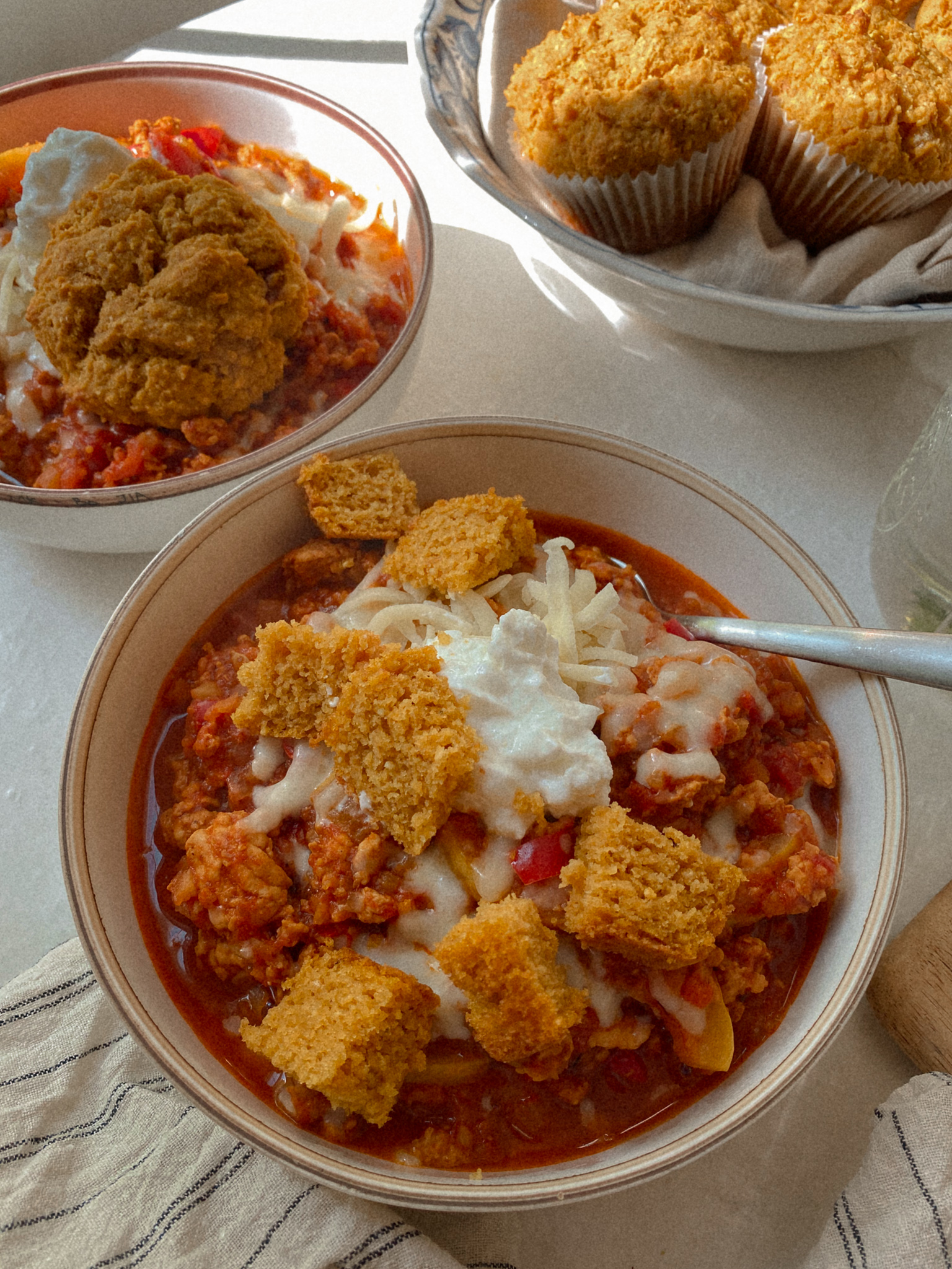 Easy Chicken Veggie Chili With Gluten Free Pumpkin Cornbread - But please feel free to use what ever cut of chicken you like and appreciate all the wonderful vegetables that make this so.