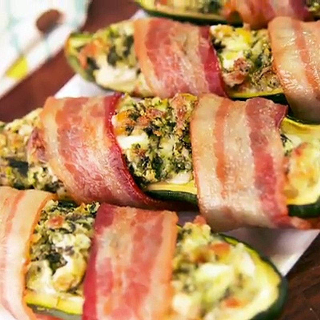 Keto Bacon Wrapped Stuffed Zucchini Keto Bacon Wrapped Stuffed Zucchini - Zucchini is stuffed with shredded chicken, wrapped in bacon and then baked to a crisp.
