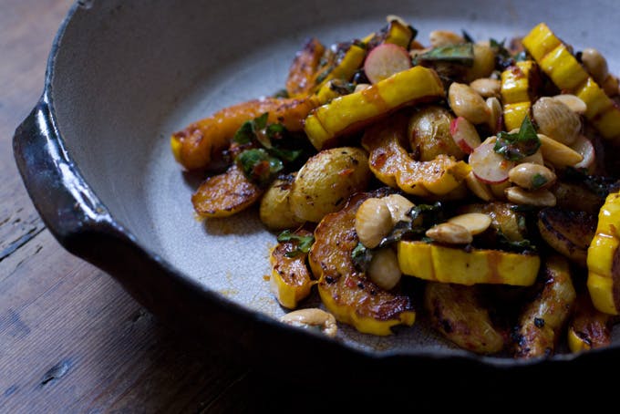 Roasted Delicata Squash And Potatoes / Delicata squash cooks in butter until it becomes soft and charred, then it gets tossed with dandelion greens in a punchy pomegranate dressing.